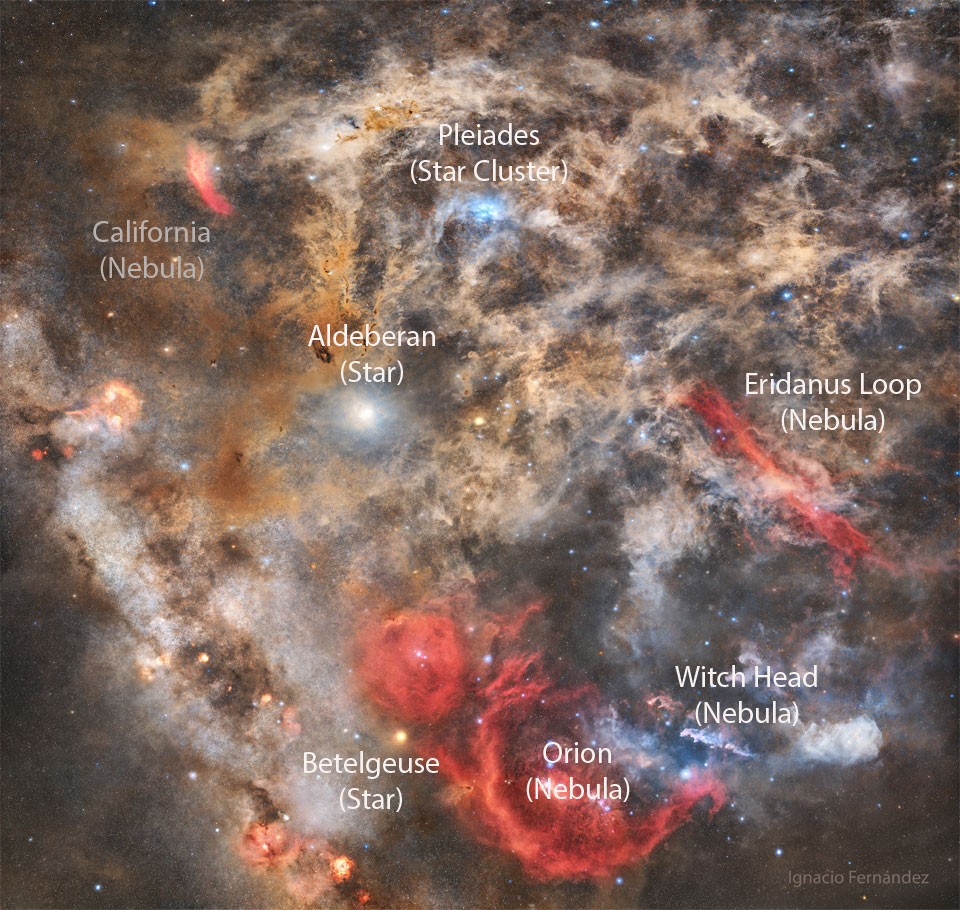 Pojasnilo: Kako dobro poznate nočno nebo? V redu, ampak kako dobro lahko prepoznate znane nebesne objekte na zelo globoki sliki? Kakorkoli že, tukaj je preizkus: poskusite najti nekaj znanih ikon nočnega neba na globoki sliki, napolnjeni s filamenti običajno šibkega prahu in plina. Ta slika vsebuje zvezdno kopico Plejade, Barnardovo zanko, Orionovo meglico, Aldebaran, Betelgezo, meglico Čarovničina glava, Eridanovo zanko in meglico Kalifornija. Če želite najti njihove dejanske lokacije, je tukaj različica slike z opombami. Razlog, zakaj je ta naloga lahko težka, je podoben razlogu, zakaj je sprva težko prepoznati znana ozvezdja na zelo temnem nebu: tapiserija našega nočnega neba ima izjemno globoko skrito kompleksnost. Predstavljena kompozitna slika razkriva del te kompleksnosti v 16 urah osvetlitve neba na temnem nebu nad Granado v Španiji.